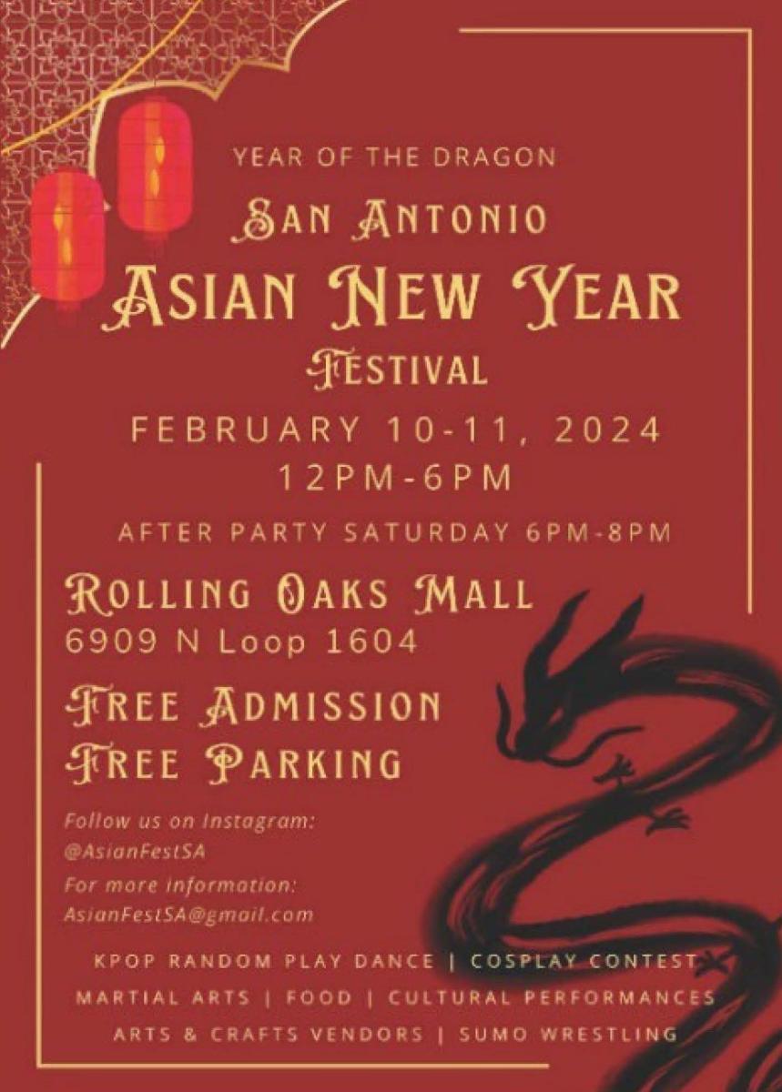 Asian Festival 2024 San Antonio – 🧧 Celebrate the Asian New Year at Rolling Oaks Mall from 12-6pm on Saturday and Sunday. Tim’s Oriental and Seafood Market is also hosting a New Year Lion Dance on Sunday at 2pm. Get more local . The start of the San Antonio Stock Show Rodeo, an Asian New Year festival, Valentine’s Day-themed markets and Mardi Gras celebrations are among major activities scheduled across the area. .